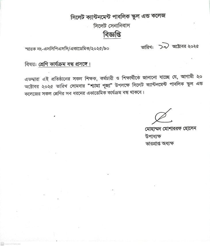 শ্যামা পূজা উপলক্ষে শ্রেণী কার্যক্রম বন্ধ প্রসঙ্গে