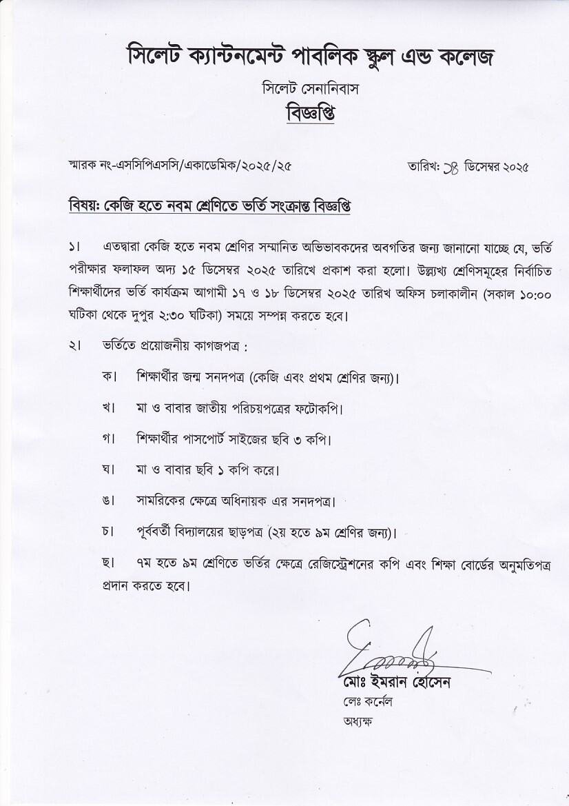 Notice regarding admission from KG to 9th grade.